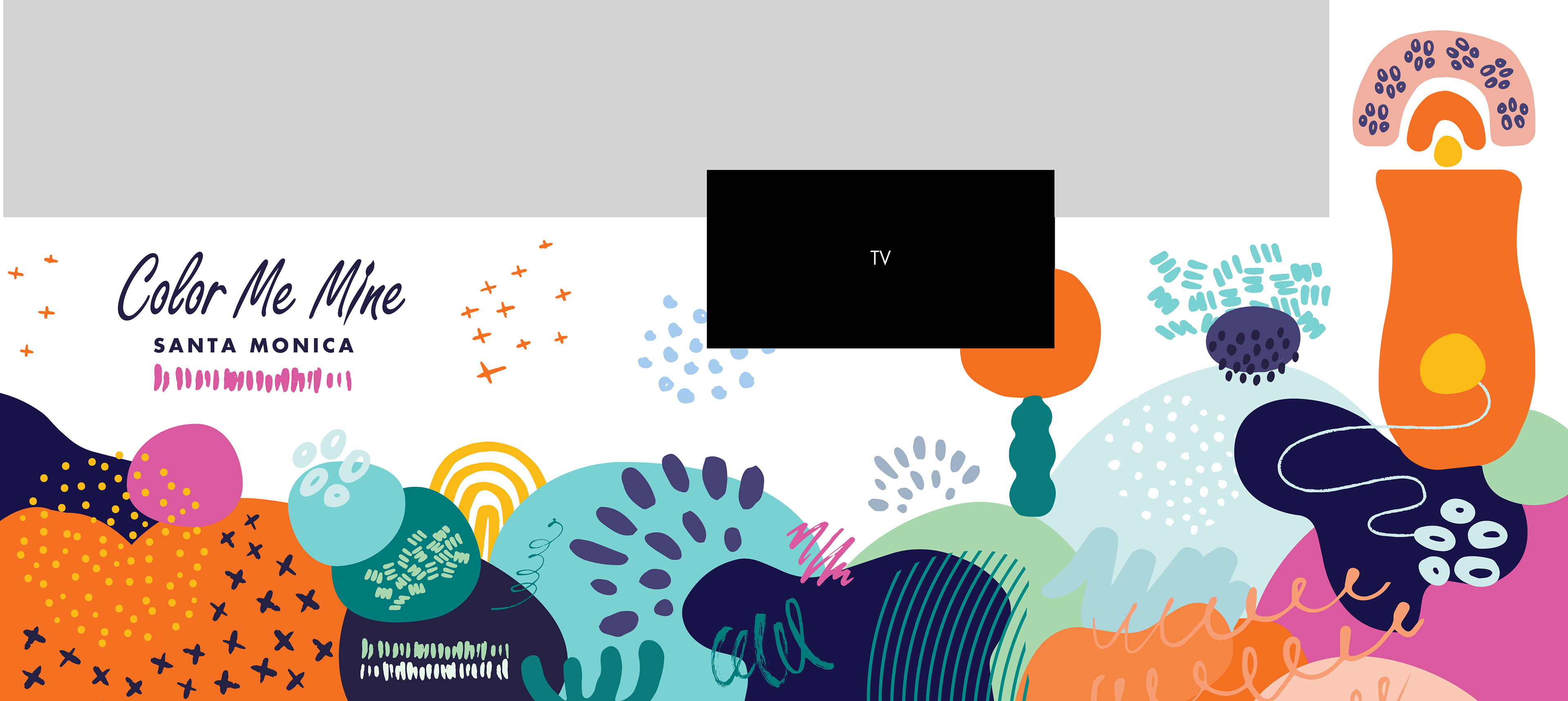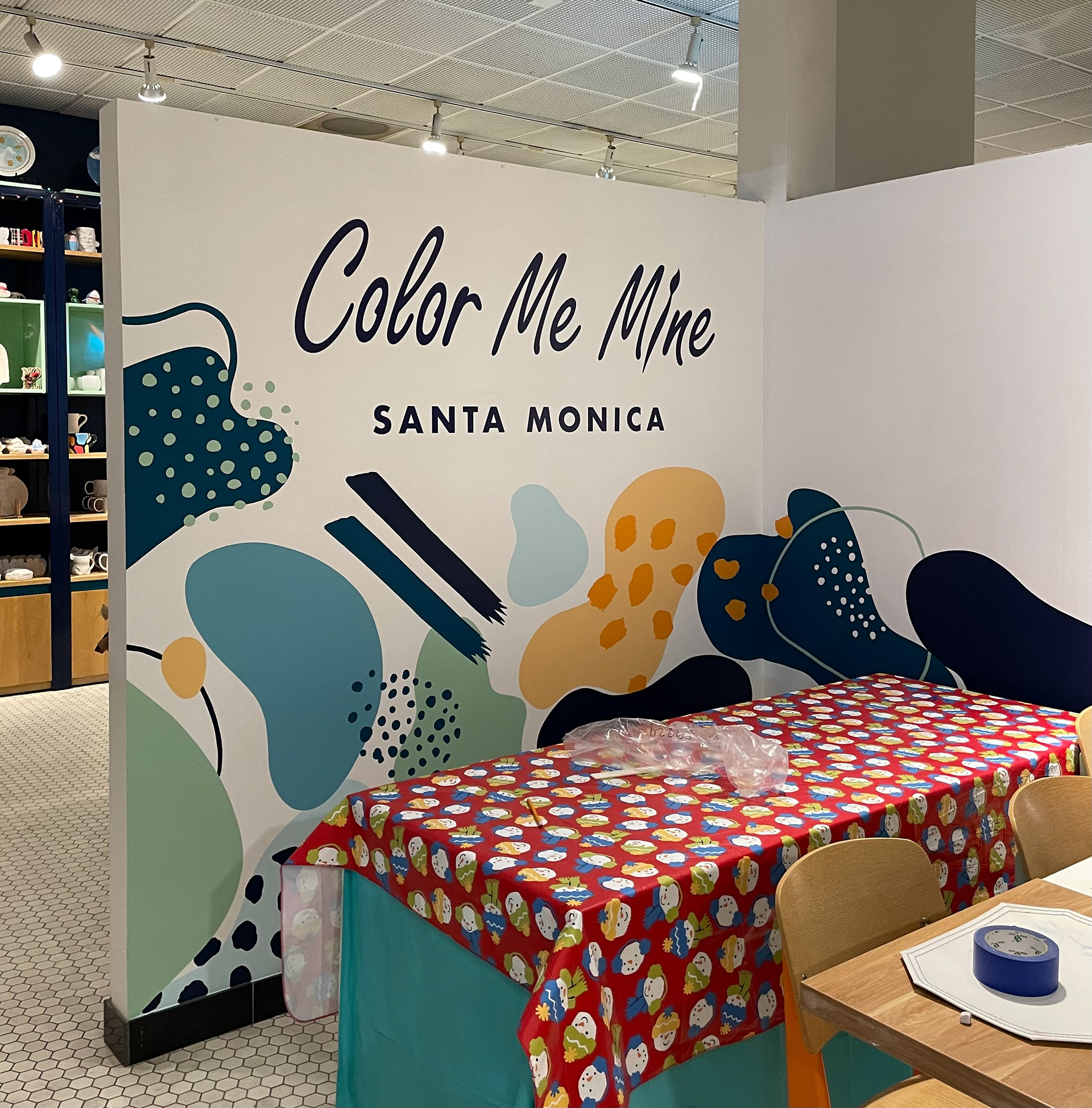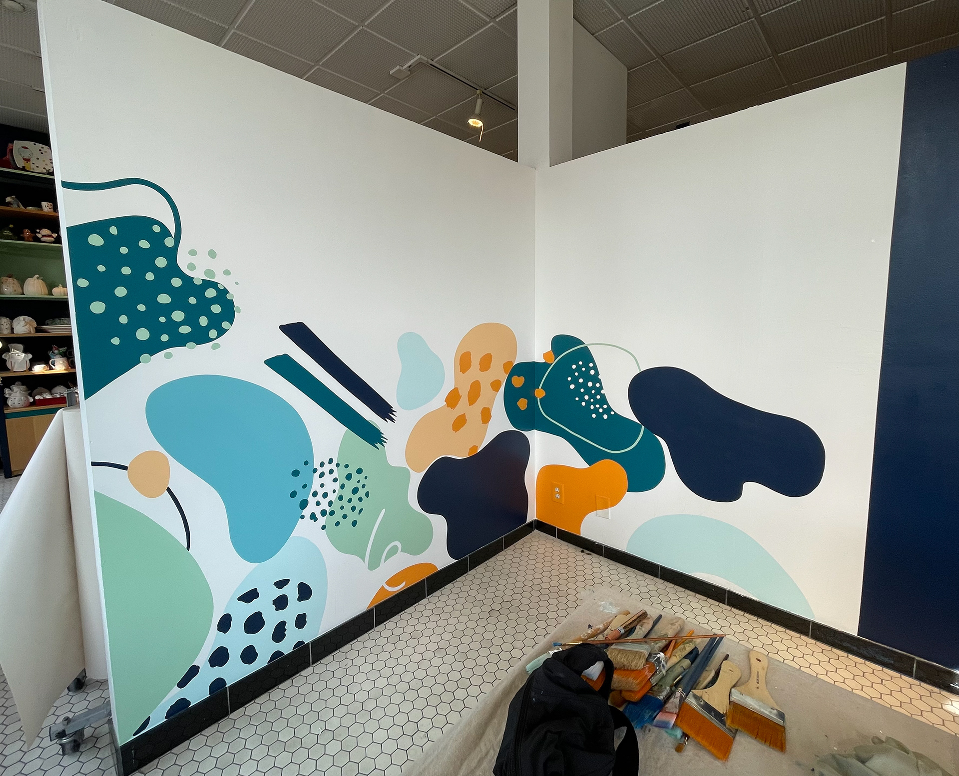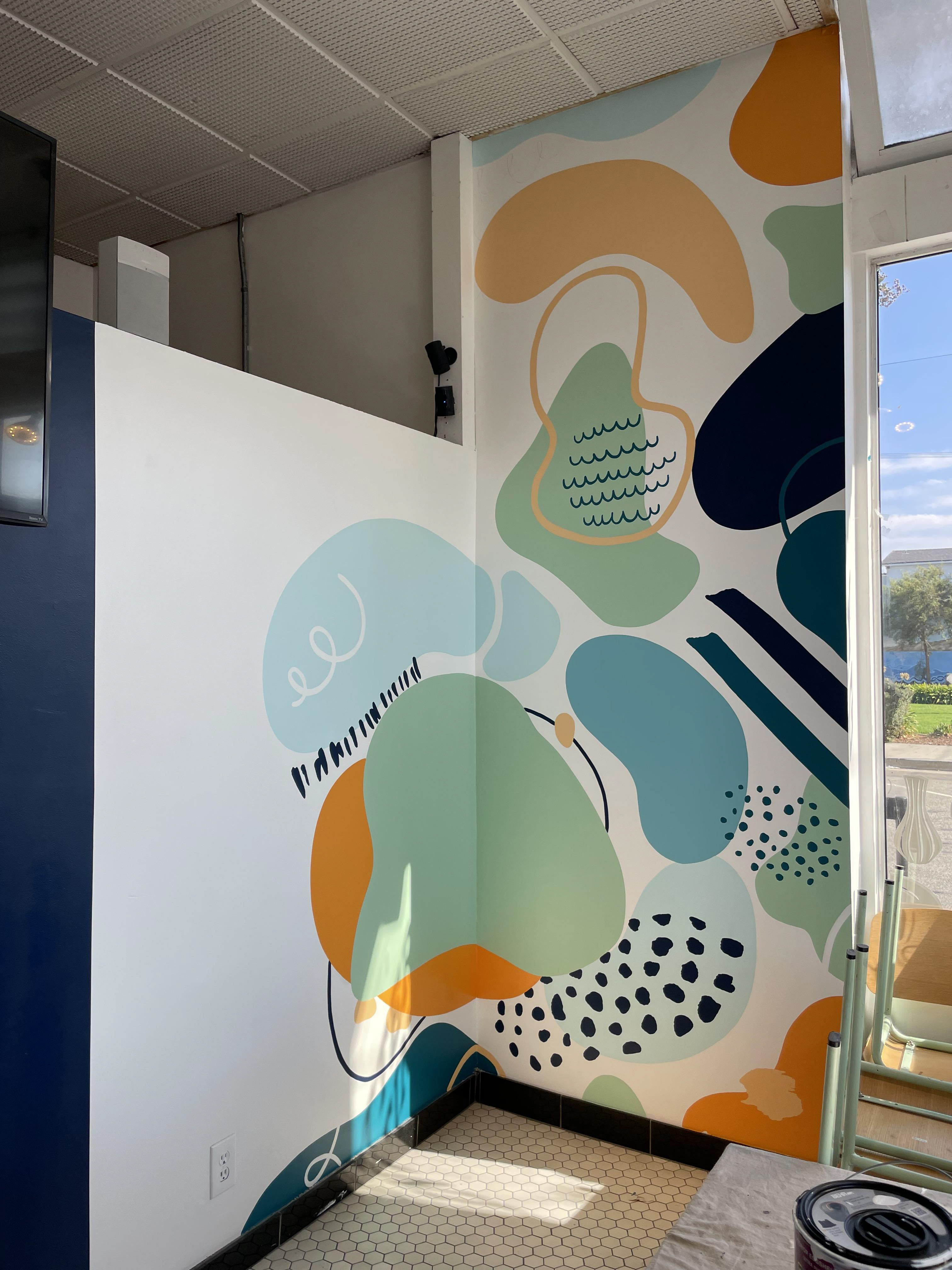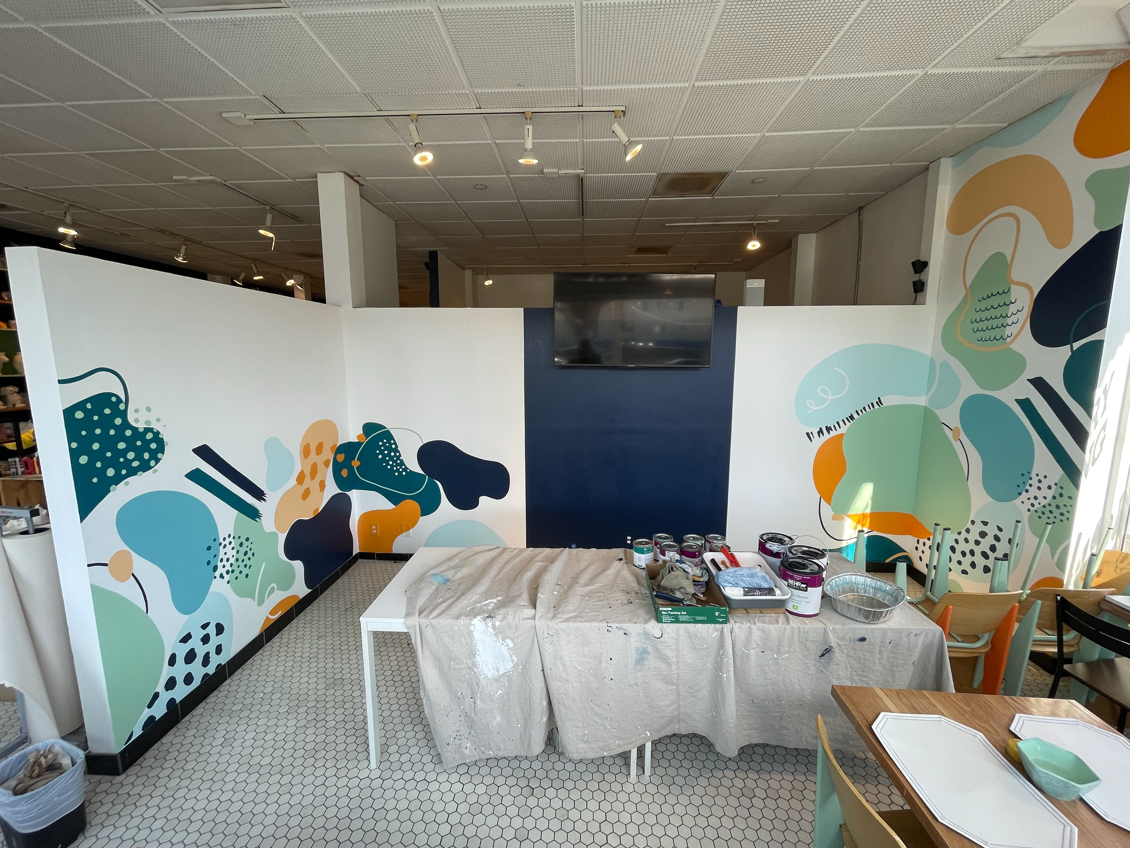 An interior mural in the street-facing room of a paint-your-own pottery studio in Santa Monica, California. I proposed a design, however, the final design the client chose was created by their corporate offices. I used the grid transfer method and the lettering is vinyl stickers. The whole project took me 30 hours to complete.