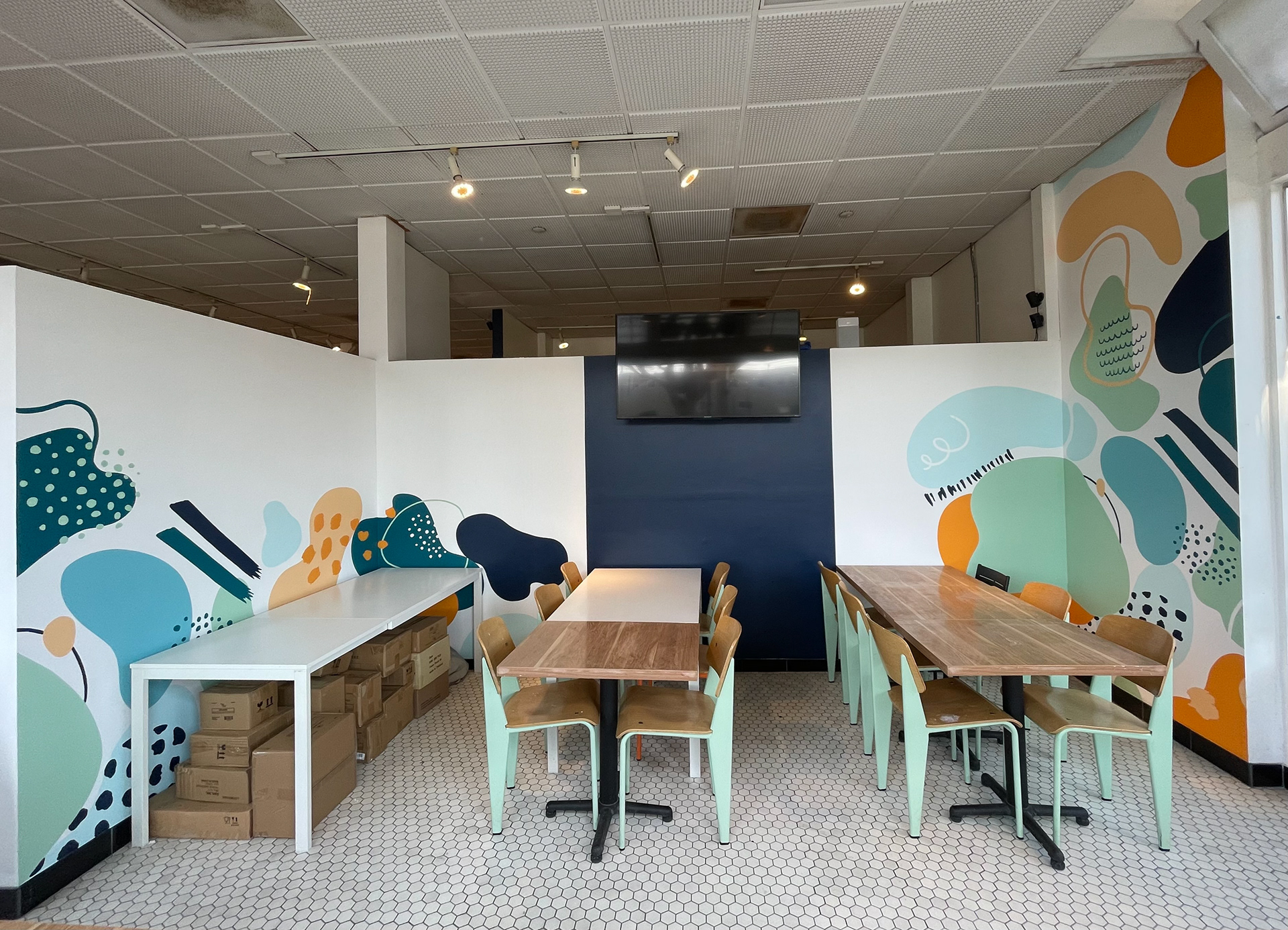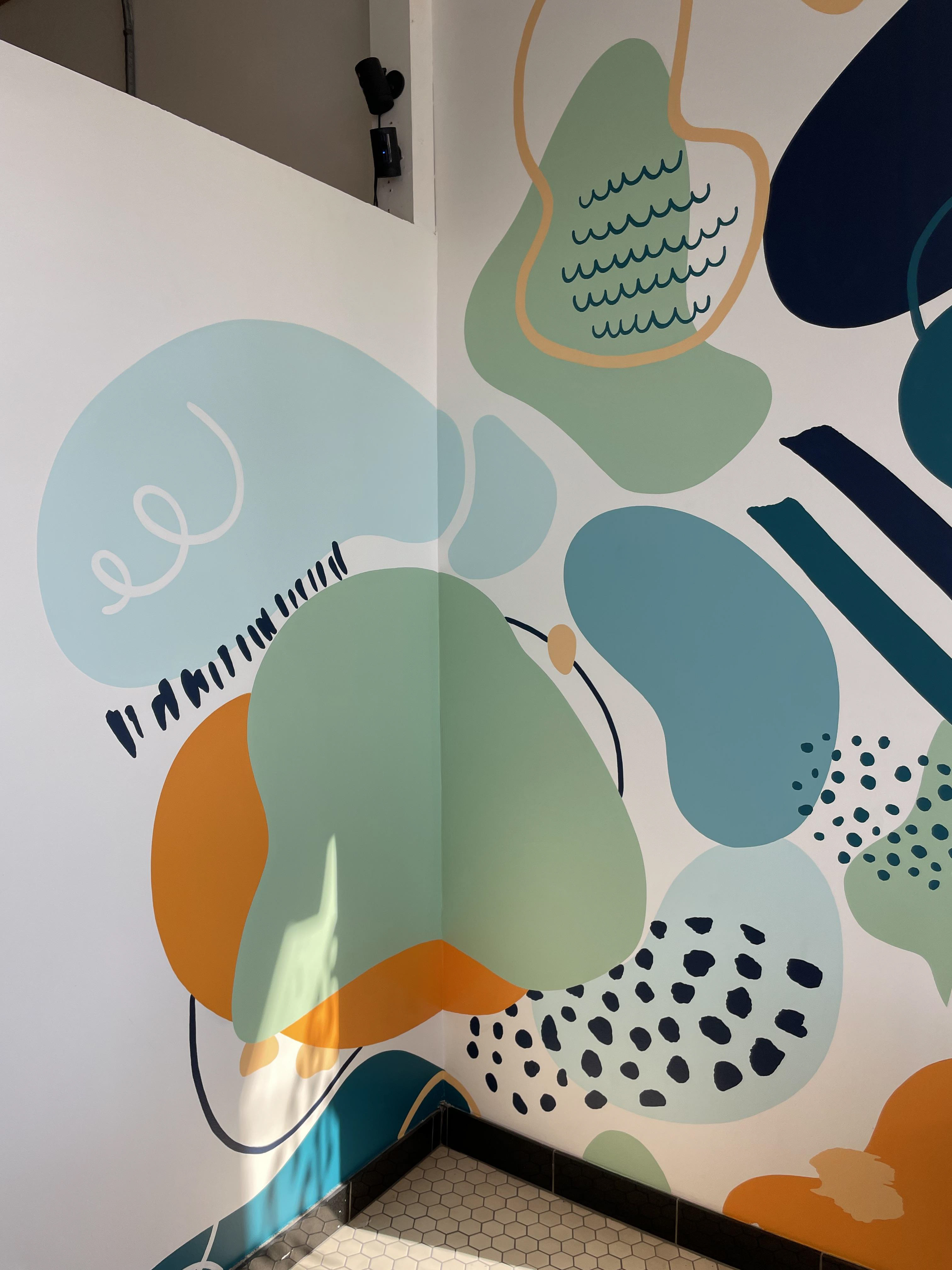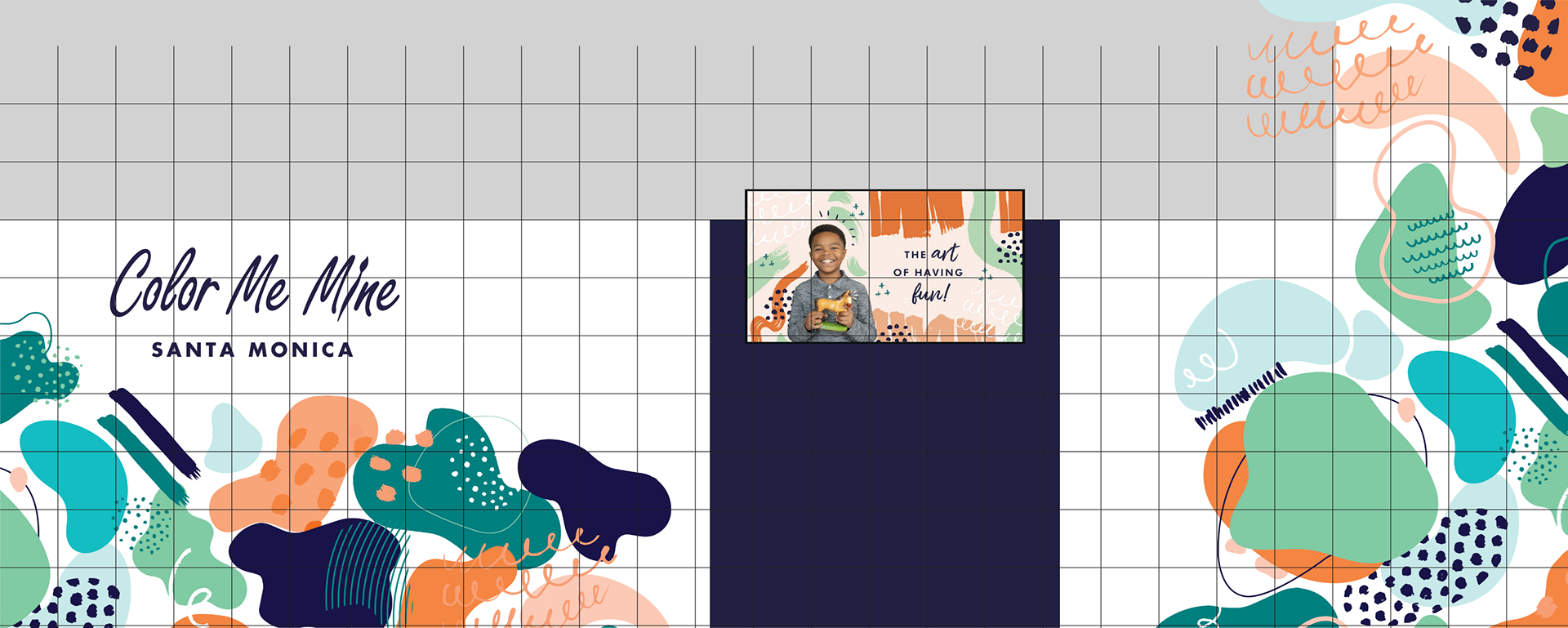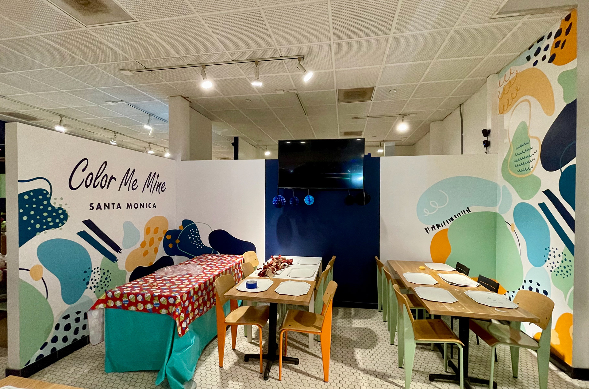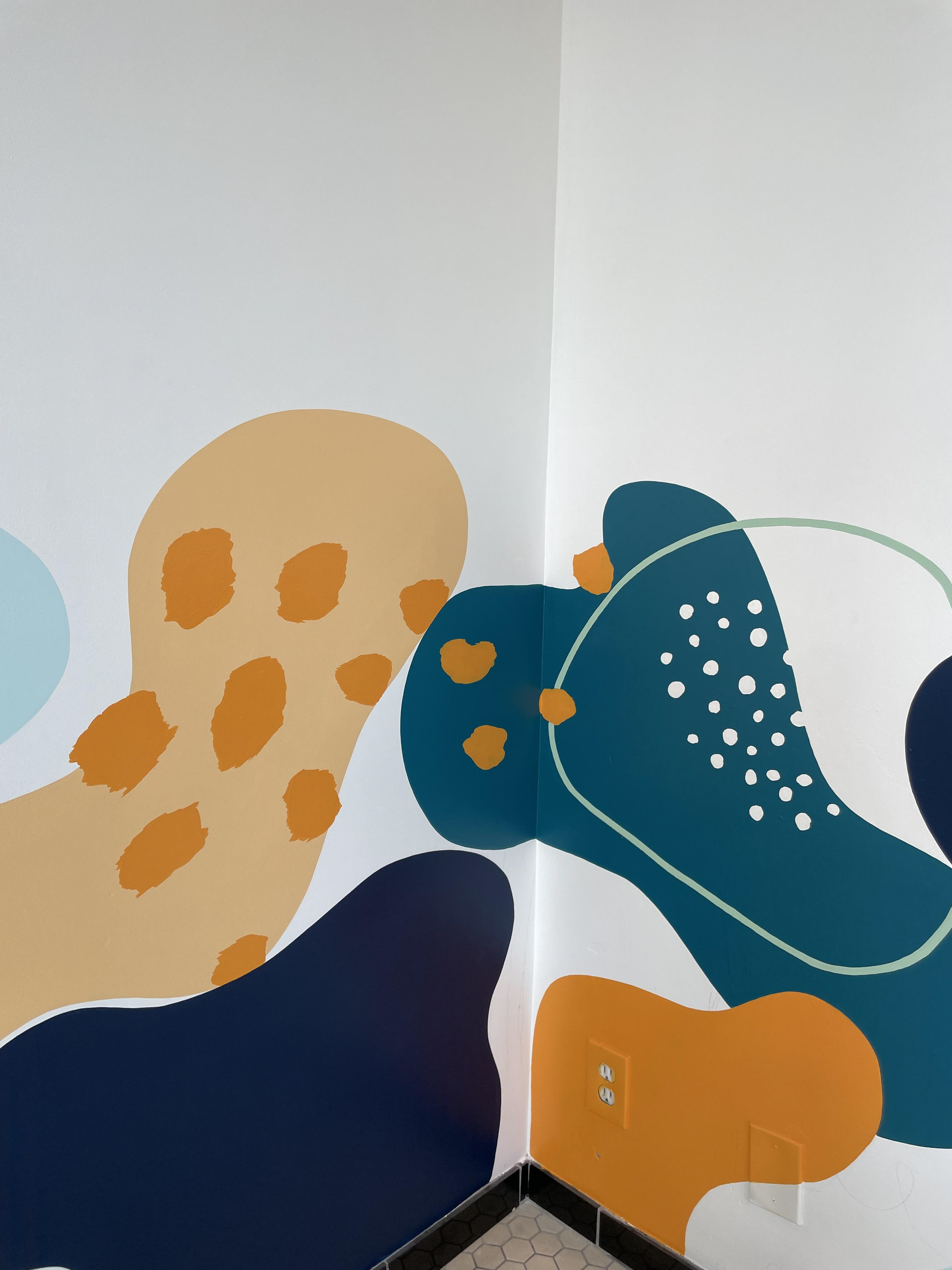 An interior mural in the street-facing room of a paint-your-own pottery studio in Santa Monica, California. I proposed a design, however, the final design the client chose was created by their corporate offices. I used the grid transfer method and the lettering is vinyl stickers. The whole project took me 30 hours to complete.